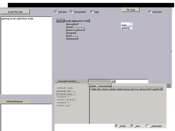menschen ziehen ihre welten nur noch zusammen oder ausnahmsweise auch mal übereinander oder durcheinander. wir schaffen "realität", texte, teppiche, dinge inmitten. wir rumpfwesen, die sich auf fahrrädern, flugzeugen oder anderen (immer digitaleren) informationskanälen weiten (vgl mcluhan) und weiterverknüpfen --- zu den knotenpunkten in denen sich noch unterscheidbare realitätsströme aufhalten und entfalten können. nic-las ist in diesem sprachspiel eigentlich der teppich aus the big lebowski, der teppich, der das zimmer zusammenhielt [ www.nic-las.com ]. medien als teppiche sind nicht mehr nur vermittler von informationen, der rumpf-mensch hat längst begonnen in diesen anschlüssen zu leben, zu sein, sich durch sie zu definieren, identifizieren, infizieren und kontrollieren zu lassen (vgl. flusser cerebralisierung). der (cyber)mensch erwartet nunmehr alles auf dem teppich unter seinen füssen, da er weiss, dass alles möglich ist, dass die "reale" welt nur ein spezialfall des virtuellen ist, dass ein kontinuierlicher raum nur eine konstruktion verschiedener spielwelten ist --- wie die levels in quake und unreal (zur belebung von freizeiten) oder www.nic-las.com/matrix und www.nic-las.com/p1ng (zur belebung des eigenen wissenschaftsspiels). wobei das vorurteil, wonach digitale welten oft gewalttätiger als die vermeintlich real erlebten sind, sich leider allzu oft als illusion herausgestellt hat. was wenn der (foucault? / big lebowski) carpet mehr wird als eine metapher für das weben von text, wenn das weben sich als tatsächlich im wired einschreibt? natürlich geht es beim oben abgebildeten carpet, der bei jeder texteingabe [ z.b. add object -> [ edit text with the carpet tool ] ] als hintergrund angeboten wird zuerst um kontextualisiertes schreiben. genauer um ein ausfliessendes schreiben, bei dem jedes zeichen immer schon im rahmen des carpets sichtbar und in diesen verlängert wird. im beispiel führt ein schreiben des satzes "gaming ist ein spiel ohne ende" zum aufklappen der zu gaming bereits vorhanden struktur (associative | chess | game is a kind of | mcluhan | play | glissment), die sich um den text legt. jedem dieser bereits ins system eingeschriebenen differenzen (= links) unterliegt ein (un-)sinnhaftes (und sofort verfügbares) angebot an anschlussmöglichkeiten. gleichzeitig spielen im hintergrund ablaufende services assoziationen zum geschriebenen aus angekoppelten (exo) web-pages (wie google, wordnet oder dem assoziations-blaster) und dem aktuellen nic-las selber (endo) ein, die über den informationspool in den gerade geschriebenen text kopiert werden können. der zusammenzug von kontextgerechten bildern ist ebenfalls technisch schon umgesetzt und will zu weiteren konstruktiven verunsicherungen führen. gleichzeitig generiert sich auf dem carpet eine struktur, die bereits mit sinn hinterlegte begriffe (im beispiel game) chronologisch anordnet, und einen roten faden durch den gerade erst entstehenden text legt --- immer aus dem blickwinkel der communitie(s), in denen man gerade kon-text(e)-ualisiert schreibt. mit [ insert this text ] wird das aktuelle kunstprodukt dem system als neues objekt dann eingeschrieben --- ein weben, bei dem sogenannten autoren die verknüpfungen und abhängigkeiten von schreiben und geschrieben werden augenscheinlich verfliessen ... ... wir weben am teppich aus "the big lebowski", dem teppich, der das zimmer zusammenhält, der nach-modernen form von bauklötzchen und netzwerken, mit denen wir zu spielen lieb(t)en --- doch im unterschied zu denen, gibt es da noch etwas lebendig-digitales (on/off), organisch-1rganisches, ein immer wieder ankoppelndes, nebenläufiges, zusammenspielendes vergessen, verrotten, services, auslegen, information wie in benjamin's 13 thesen zum erfolg --- und warum es so einfach auch nicht mehr geht ___ die letzte antwort? am ende und anfang ist ein spiel mit code, sichergestellten ausführbarkeiten, selber schreiben lernen, letztlich an medien ( = anderen carpets, zusammenzügen) schreibend, nicht mehr nur an büchern ___ das ist es, die ehemaligen zeichen der schriftsteller werden andere und mehr; es geht nicht mehr nur darum, text zu produzieren, obwohl wir das (zufällig oder gezwungenermassen auch noch tun), sondern vor allem und auch immer mehr darum, an medien, an formen, am + im dazwischen zu schreiben + diese(s) zu zeigen, zur verfügung zu stellen, zu verkaufen, verändert zu wissen _ die suche führt über die produktion von text-produktionsmitteln --- ein sammeln, denn in unseren welten liegt alles immer schon da, die frage ist nur, wie wir dies (man ist geneigt zu sagen: wie wir dieses offene buch) gerade wiederfinden, wieder schreiben, umgiessen und sichtbar halten _ und wie andere daran weiterschreiben und es wiederfinden können _ was man so kommunikation nennt, gegenseitiges aufeinander bezug nehmen (von dem wir auch analog wieder eine menge gebrauchen könnten, um nicht im gegenwärtigen und gegenseitigen neobiedermeier sogenannter medienrevolutionen versumpft zu bleiben), obwohl es eigentlich nie nichts zu verstehen + ((mit)zu)teilen gibt _ und trotzdem: gemeinsames assoziieren, verwerfen und verworfen werden, löschen, klauen und geklaut werden, endlich wieder was mit der welt (an und in der wir schreiben) anfangen können _ ganz ähnlich wie früher bücher, artikel, glossen --- mit denen ja auch je manche (jedenfalls teilweise) was anfangen konnten _ und doch ist alles immer anders _ denn wir schreiben ja nicht mehr nur an büchern, sondern an medien _ einem dazwischen, zusammengezogenen, menschlichen oberflächen, oberflächlichen menschen die als software auf systemen laufen --- wenn überhaupt. looking glasses sind die spiegel,