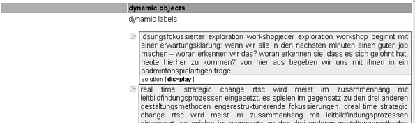 medien | möglichkeits(t)räume | projekte | nic-las ist ein werkzeug für's digitale und ein lebendiges digitales medium, das (mindestens teilweise) tut, was benutzer sich vorstellen wollen. nic-las schafft die möglichkeit, sich in bewegende-digitale räume einzuschreiben und dabei erst noch für sich und andere beobachtbar zu bleiben. basierend auf der systemtheorie von niklas luhmann liegen die basisoperationen in vielfältigen nicht-linearen verknüpfungsmöglichkeiten von textstellen und zitaten (automatische verknüpfungen nach keywords ebenso wie ein differenziertes meta-auszeichnungssystem etwa für personen- und sachregister oder zuordnungen und zugriffsrechte für verschiedene autorinnen) und in dynamischen diskursiven und kommunikativen operationen (wie intuitive und assoziative annotationen und kommentierungen). gerade diese verbindung von hierarchischen und rhizomatisch-assoziativen organisationsoptionen ermöglicht eine intertextuelle praxis des schreibens mit konstruktiven versunsicherungseffekten zwischen lesen und schreiben. im kontext kulturwissenschaftlicher wissensproduktion in digitalen netzwerken soll in den gerade sich belebenden hypermedien nicht mehr nur rezipiert werden (=gelesen), sondern kulturkritische hypermediale diskurse auch initiiert, ent(ver)worfen, gestaltet (=geschrieben) und in die kommunikativen strukturen der netzwerke beobachtbar zurückgekoppelt werden --- dieser prozess findet mit gewinn in sich selbst-organisierenden communities statt. eine vollständige integration in eine community erfolgt nur dann, wenn auf ihre einträge reagiert wird, d.h. (d)ein eintrag zum [ beitrag ] wird, der sich in das kollektive (ge(h))wissen verwoben findet. im gegensatz zu anderen kollaborativen netzliteratur-projekten und anders als in vielen kollaborativen schreibumgebungen ist in nic-las das heraufladen, löschen, verändern und manipulieren von eigenen und fremden daten in form von text, bild, film, etc. möglich. nic-las thematisiert das manipulieren, speichern und löschen ganz explizit, indem gelöschte daten aus einem unterbewussten auf einmal wieder auftauchen und die jüngst gelöschten objekte in den news sichtbar werden können. man darf sich auch als reaktionen auf diese (anregenden) verunsicherungen eingeladen fühlen, weitere unterscheidungswürdige begriffe [ new diff ] und objekte [ new object ] oder kommentare [ add-comment ] einzubringen. die struktur [ structure ], und der daran gekoppelte + sich im gebrauch erschliessende index [ index ], geben auskunft über die für eine nic-las-community charakteristischen unterscheidungen --- oder eben ihre systemsprache. und das ist erst der anfang. nunmehr ins digitale übersetzte funktionen, die schon benjamin und luhmann bei ihren passagen durch immer noch personenzentrierte zettelkasten-universen zur verfügung hatten --- wie denken sich unsere zettelkästen in the wired? [ text: heiko idensen | nic-las ] [ nic-las als tool ] möglichkeits(t)räume da nic-las web-basiert ist, können verschiedene leute gleichzeitig (von beliebigen orten aus) an unterschiedlichsten objekten weiter arbeiten, sich austauschen und aufeinander reagieren. jedes objekt kann in nic-las mit beliebigen weiteren objekten (texten, bildern, tönen, etc.) kommentiert werden [ add comment ]. objekte können auch an verschiedenen orten (= in unterschiedlichen differenzen) gleichzeitig sichtbar werden --- entweder qua willentlicher zuschreibung [ add comment > add label ] oder als von nic-las vorgenommene automatische zuschreibung in der form von dynamischen oder unbewusst zugeordneten objekten. gleichzeitig experimentieren wir mit einer vielzahl von nebenläufigen prozessen oder systemaufsätzen. java servlets, die wie gewöhnliche objekte ins nic-las eingang finden, dann aber ein eigenleben entwicklen --- z.b. indem sie bilder, wortdefinitionen, oder passende assoziationen von suchmaschinen ins system holen gehen, die auf den gegenwärtigen aufenthaltsort (oder besser zusammenzug) in nic-las bezug nehmen und antworten. als traditionelles orientierungs-tool steht auch ein kalender [ calendar ] zur verfügung, der das einfügen von terminen, besprechungs- und tagebucheinträgen ermöglicht, welche wiederum mit allen objekten in nic-las verküpft werden können. ein schönes beispiel für den einbezug der zeitdimension findet sich in in dem von stefan hofer eingesetzten www.nic-las.com/migrationsliteratur (am deutschen seminar der universität zürich). nic-las ist so offen wie digital denkbar konzipiert, ermöglicht jedoch eine selbstanpassung der strukturen und beschränkung von zugriffs- oder veränderungsrechten an die jeweiligen bedürfnisse. nic-las als medium, ist eine form für digitale kommunikation und als solches immer genau, was ihr daraus macht + manchmal auch ein bisschen mehr. nic-las wartet mit einer sehr einfachen aber neuen idee auf, nämlich der automatischen einordnung und indizierung von informationen. dadurch bietet sich dieses digitale medium unter anderem als sehr flexibles werkzeug für das sammeln, umschreiben und beobachten kollektiven wissens an. auf einfache weise können informationen über die anmutung, entwicklung und struktur grosser wissensbestände erlangt werden. abstrakt gesprochen geht es uns mit nic-las auch darum, es communities zu ermöglichen, sich selbst im prozess der ständigen aktualisierung der für sie relevanten informationen zu beobachten + ihnen dadurch anschlussoperationen zu ermöglichen. ganz im sinne des frühen virilio, nach dem es wieder darum geht, momente der entscheidung und der faktischen entscheidbarkeit, herbeizuführen. [ nic-las ] projekte im moment gibt es ungefähr 30 communities, die ihre kommunikation mit nic-las selbst-organisiert sehen --- eine auswahl umfasst ...